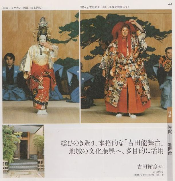 1986年11月、能楽と地域の文化振興を目的に、開業医であり能楽愛好者でもあった故吉田祐彦が鹿島市大字中村の旧吉田病院の横に、私財を投じて建設したのが吉田能舞台です。