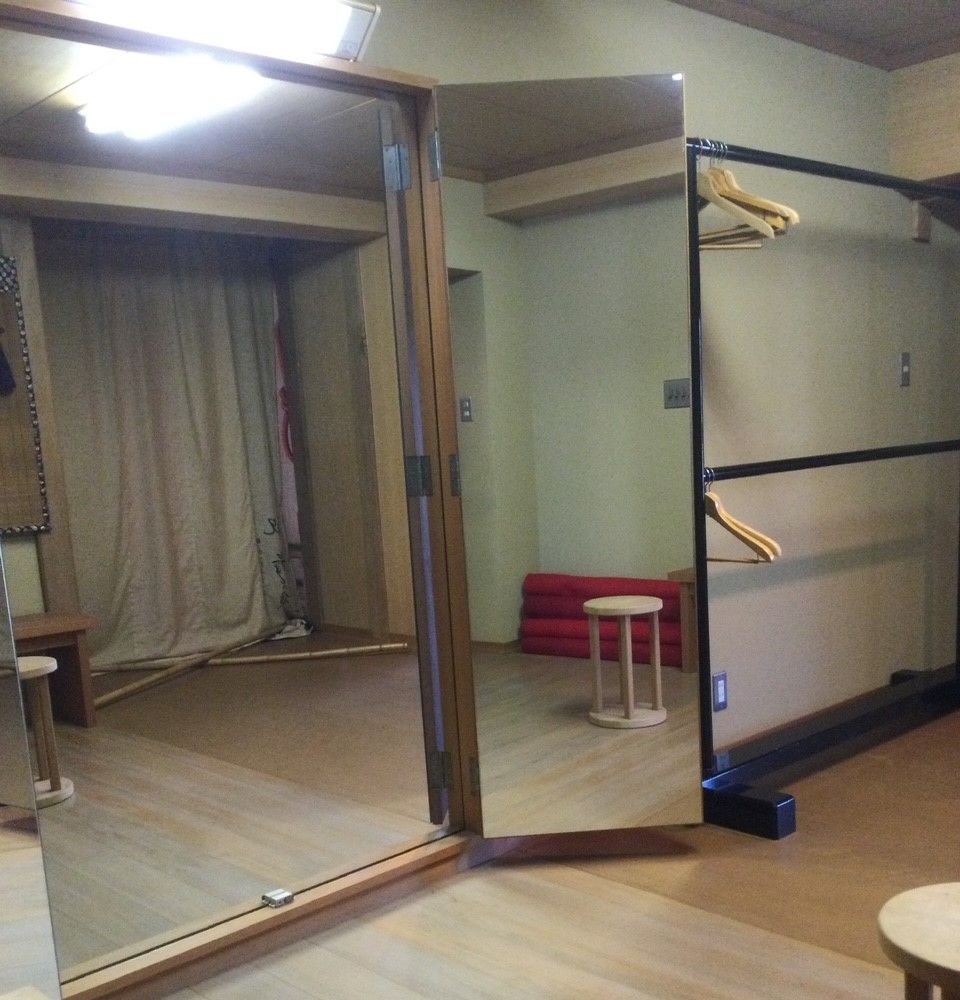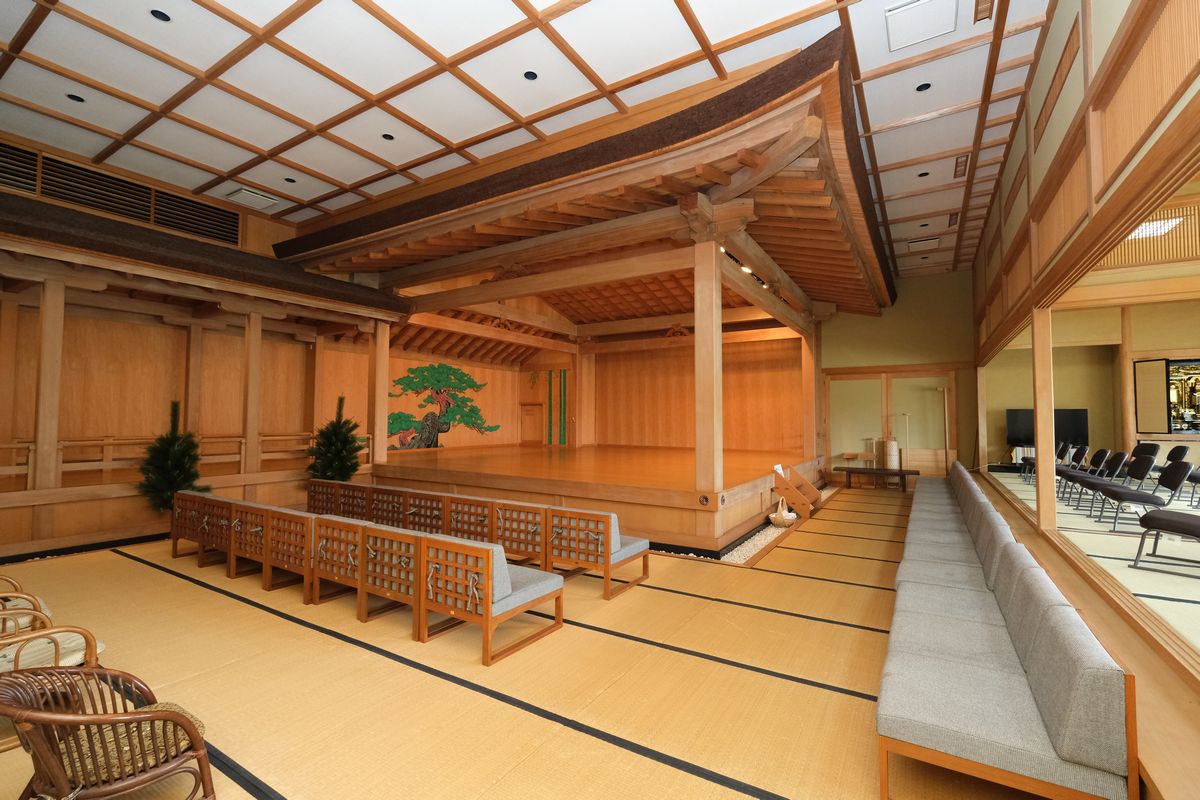 橋掛かりから揚幕の奥には鏡の間があり、二階には二つの更衣室も完備しており、見所は二段に別れ全体で五十五畳の畳敷となっています。