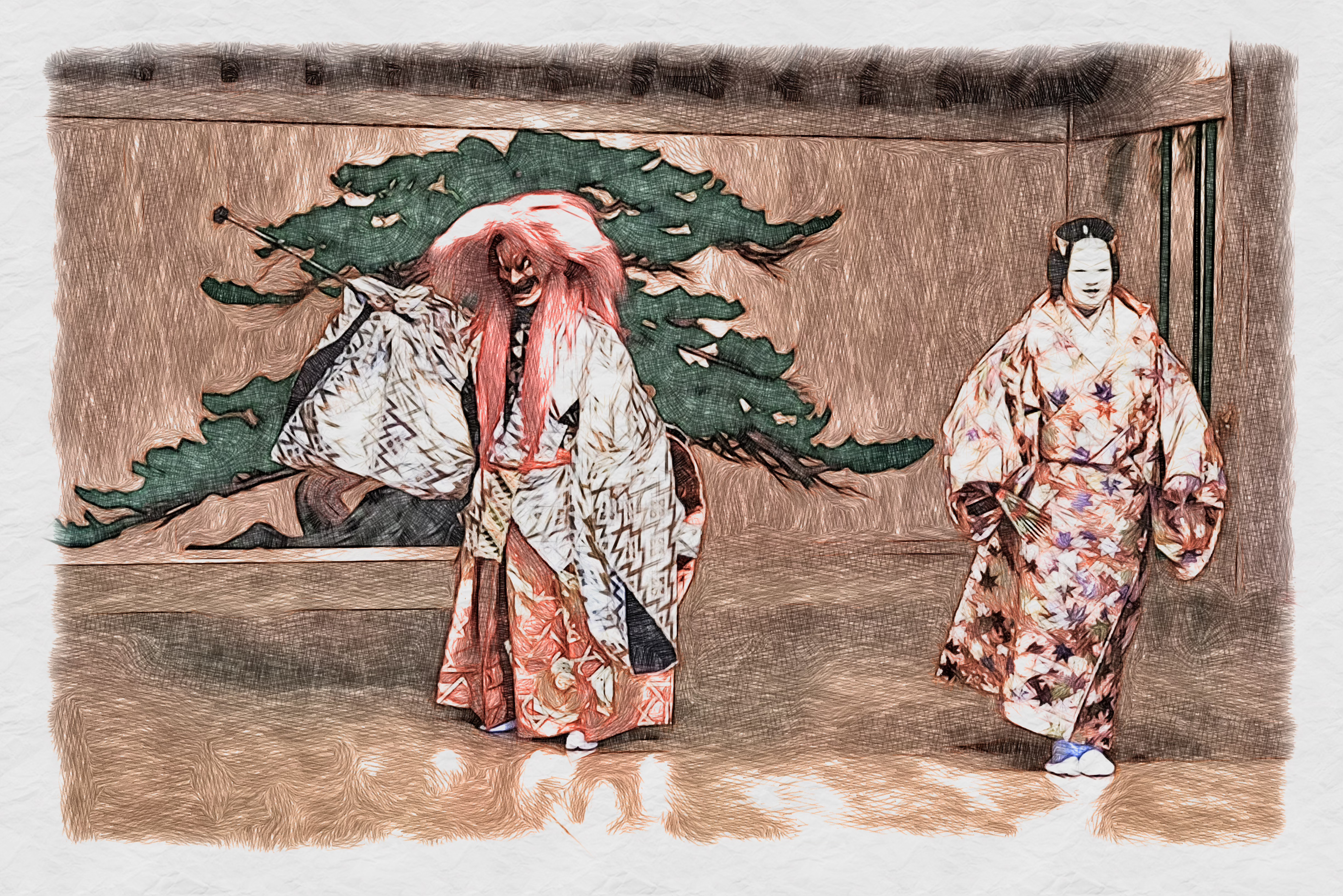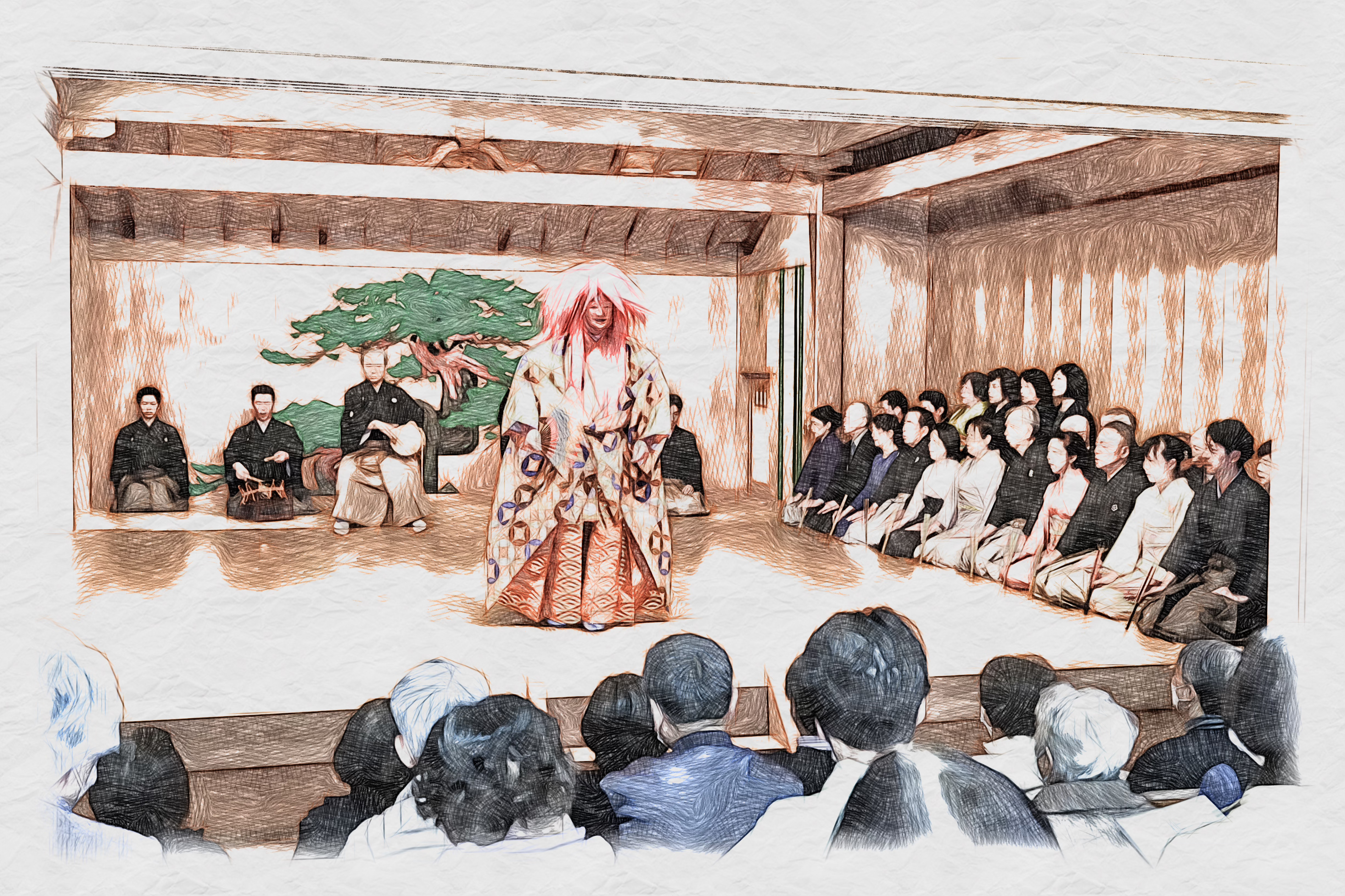 一言で言えば「面と美しい装束を用い、専用の能舞台で上演される歌舞劇」ストーリーのあるオペラやミュージカルに近い存在です。